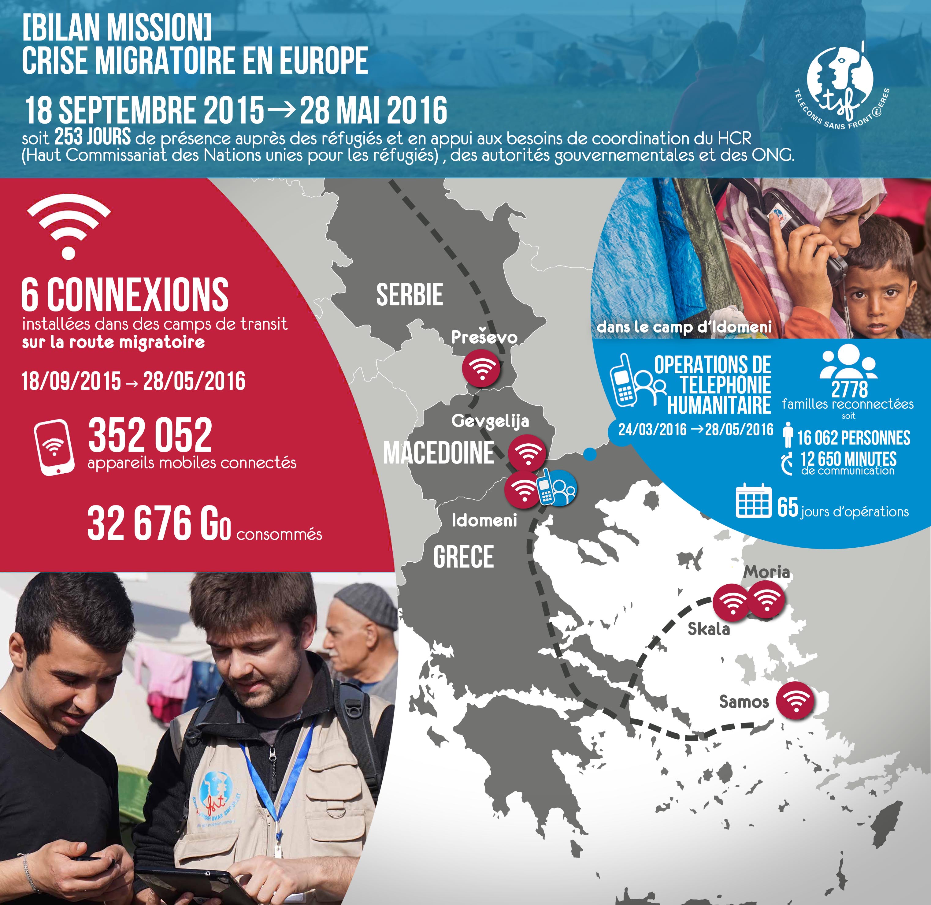 Devant cette situation, TSF a étendu ses activités à partir d'octobre 2015 en couvrant les principaux points de passage des îles grecques (Lesbos et Samos) mais aussi la route jusqu’à la Macédoine (camps d’Idomeni et de Gevgelija). TSF a installé toutes ses connexions sur des points de passage obligatoires, permettant ainsi aux migrants de bénéficier régulièrement d’un accès illimité à Internet.