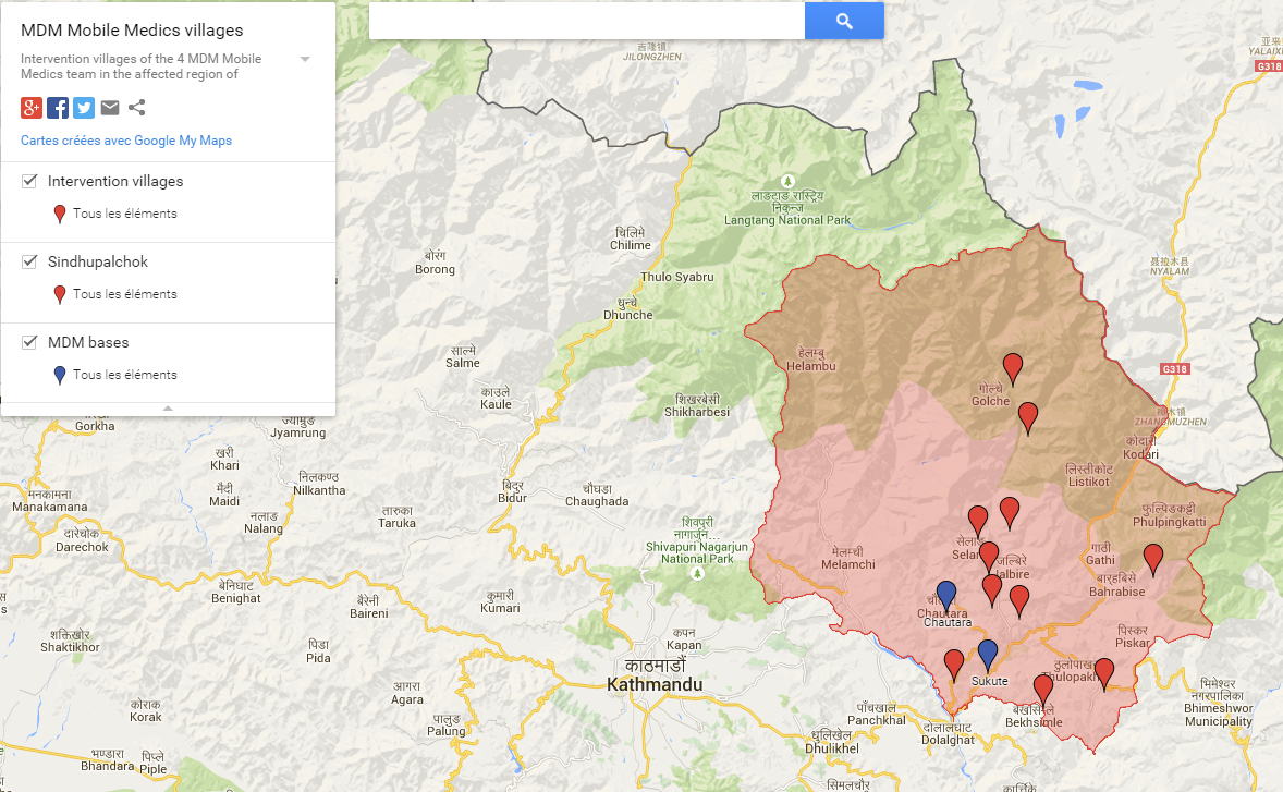 L’ONG Médecins du Monde (MdM) a mis en place des équipes de santé mobiles dans l’une des régions les plus affectées ; Sindulpachowk, pour répondre à l’urgence dans les villages devenus inaccessibles suite aux nombreux glissements de terrain. Ces équipes se déplaçaient d’abord en hélicoptère, puis à pieds, afin d’offrir consultations et traitements médicaux. Une fois leur travail terminé, les rapports quotidiens devaient être envoyés à Katmandu afin que les données soient entrées dans une base de données puis analysées pour permettre la détection de potentielles épidémies.