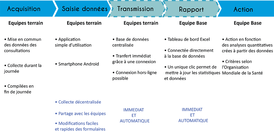 Suite aux différentes interventions des médecins sur le terrain, les données récoltées étaient ensuite automatiquement transmises sur une base de données centralisée. En un seul « clic », les équipes de surveillance de Katmandou peuvent mettre à jour leurs statistiques et tableaux de données médicales.