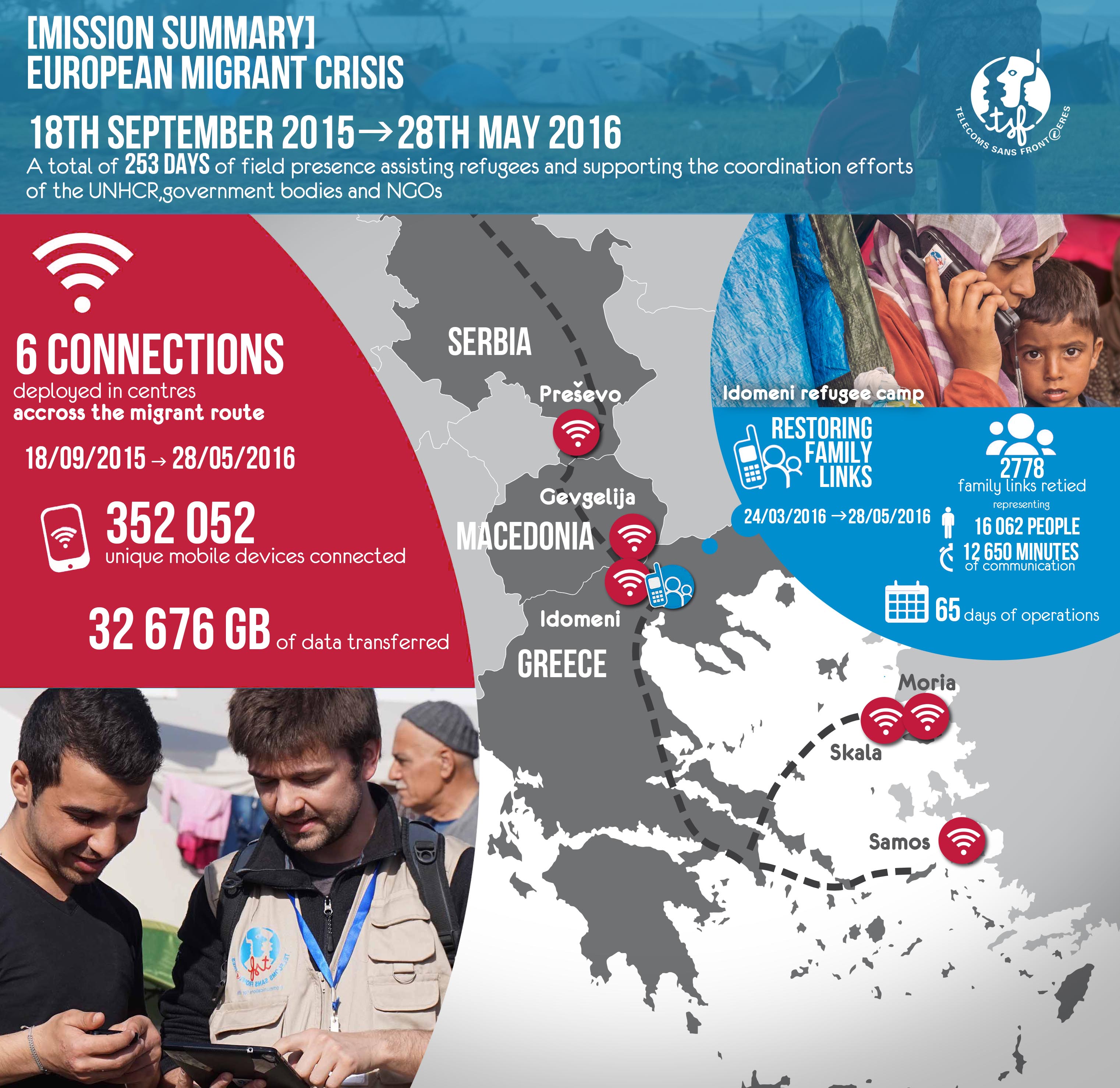 Faced with the increase in the number of arrivals, TSF extended its activities from October 2015 onwards, covering the principal points of passage on the Greek Islands (Lesbos and Samos), mainland Greece and Macedonia. All connections were installed at mandatory transit centres, meaning that families could benefit regularly from TSF unlimited Wi-Fi throughout their route.