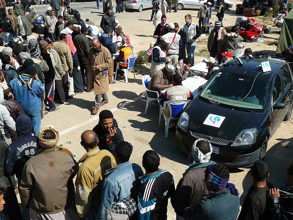 The reception and support of the displaced as well as the evacuation operations became gradually organized. As soon as the Libyan refugees crossed the border and arrived in Tunisia, they were taken care of by the civilians who organized solidarity networks for their compatriots. Libyan families found refuge in the Tunisian cities south of Ras Jedir. Transit camps near the border were being established to accommodate the growing number of foreign nationals until they were repatriated. Tunisian authorities and the United Nations High Commissioner for Refugees (UNHCR) have established La Choucha camp 6 km from the border, with a capacity to accommodate 20,000 people. This transit camp was a must for all people in Libya before a longer term solution was offered to them.