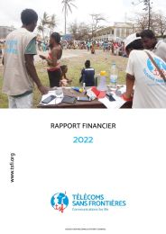 Retrouvez sur cette page tous nos rapports annuels. Le rapport d'activités présente les missions de TSF sur la période d'un an correspondance, tandis que les rapports financiers présentent les informations financières essentielles ainsi que les comptes audités. Vous pouvez les télécharger en cliquant sur l'image correspondante.