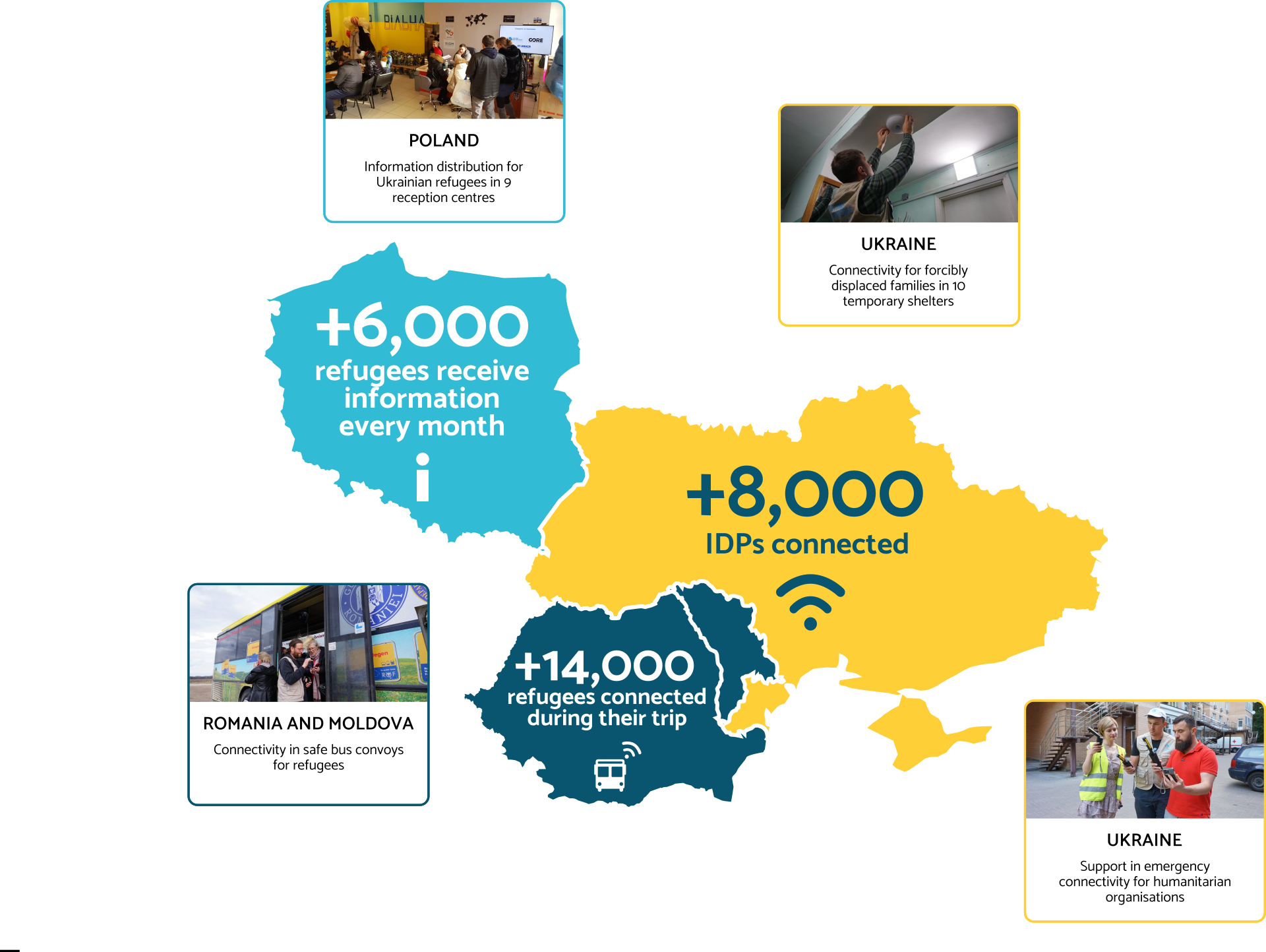 For these people, the bus journey meant long hours of uncertainty and stress after leaving their homes and lives behind. TSF installed a free Wi-Fi connection for the refugees, who were then able to contact their loved ones (83%) and obtain information on the latest developments in the war (44%).
